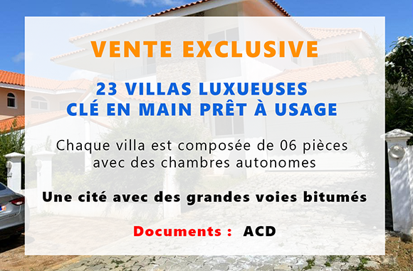 23 Villas luxueuses clé en main prêt à usage. Chaque villa est composée de 06 pièces avec des chambres autonomes. Bâtie sur 1 hectares . Cité avec de grandes voies bitumées. document : ACD.